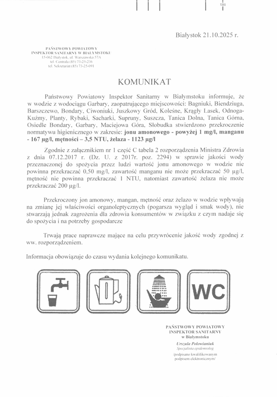 W związku z komunikatem Państwowego Powiatowego Inspektoratu Sanitarnego w Białymstoku prosimy o przestrzeganie spożycia wody przez niemowlęta i dzieci do lat 2 oraz osoby ze zmniejszoną odpornością w podanych miejscowościach.
